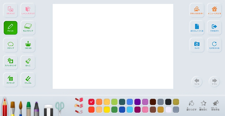 ![]() | ペイント | 色鉛筆や絵の具などで描画を行うことができます。 |