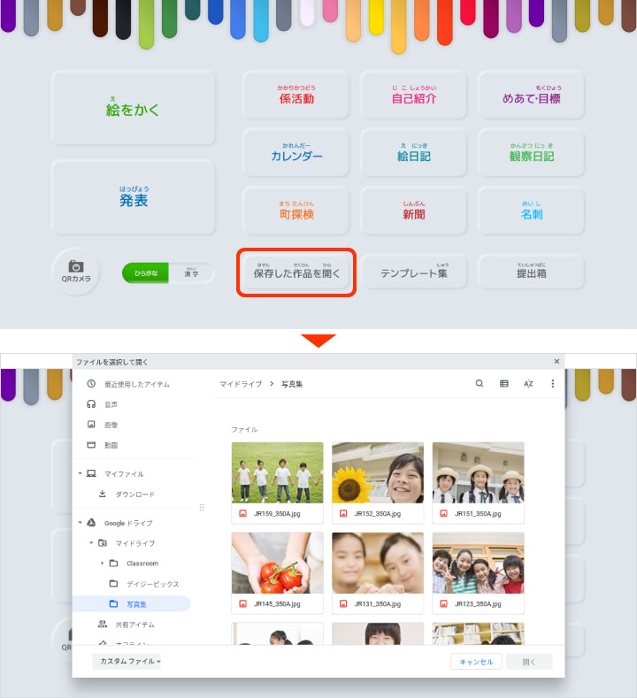 | ④ 保存した作品を開く | 保存されたファイルを開くことができます。 |