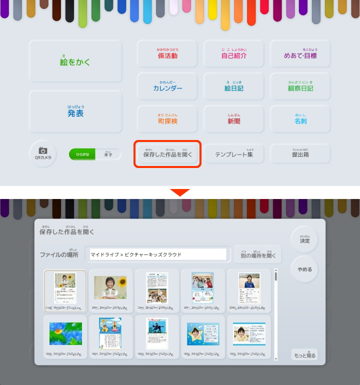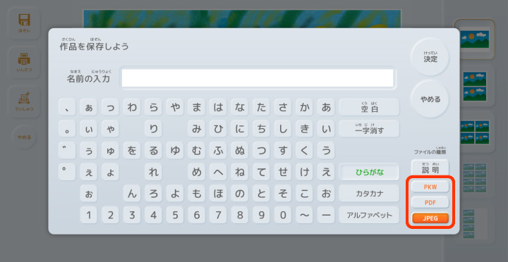 【保存した作品をえらぶ】で読み込み可能なファイルは『JPEG』『PNG』『PKW(ピクチャーキッズ独自形式)』の3種類です。