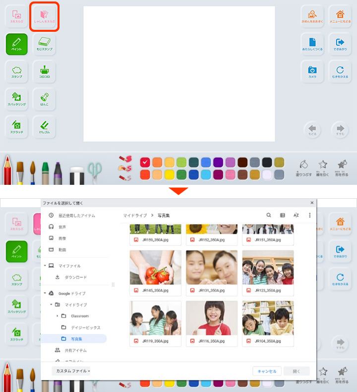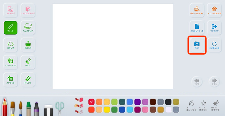 ![]() | カメラ | パソコンやタブレットのカメラ機能で写真を撮影し、画用紙に取り込むことができます。 |