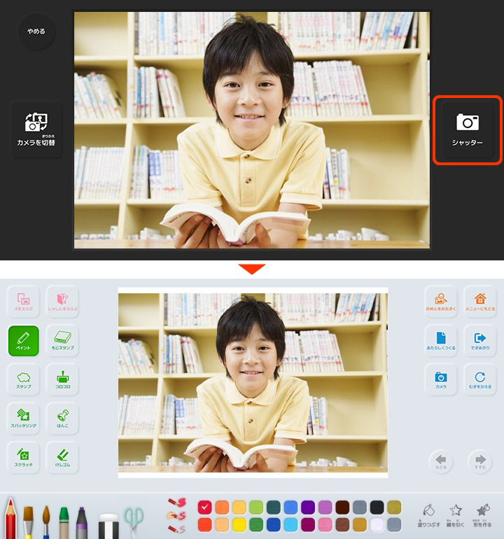やめる 撮影をせずに描画画面に戻ります。 【シャッター】を押すと、撮影した写真が直接画用紙に取り込まれます。