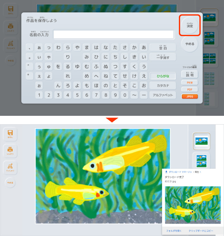 使用しているブラウザで設定された任意のフォルダに作品が保存(ダウンロード)されます。