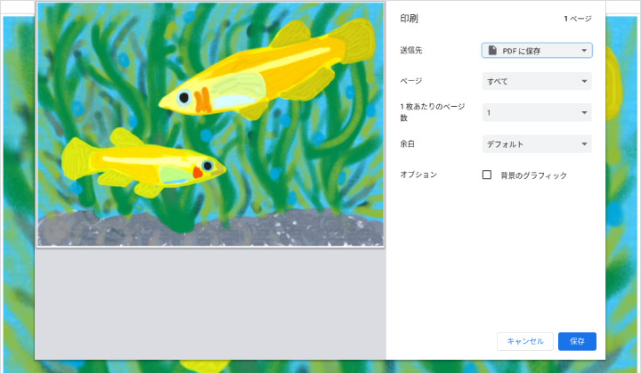【ファイルの種類】を【PDF】に設定して保存します。(ファイルを開く環境が異なる場合でも同じ状態で表示することができます)完成した作品を画像として保存する場合