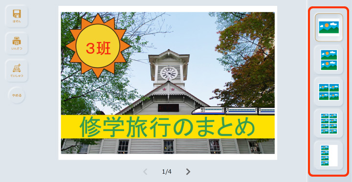 ![]() | 発表リスト | 編集したいスライド(画用紙)を選んだり、スライドの数や内容を確認することができます。 |
