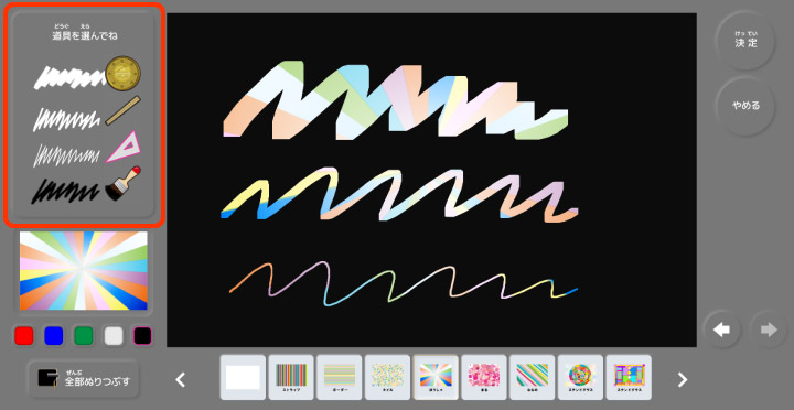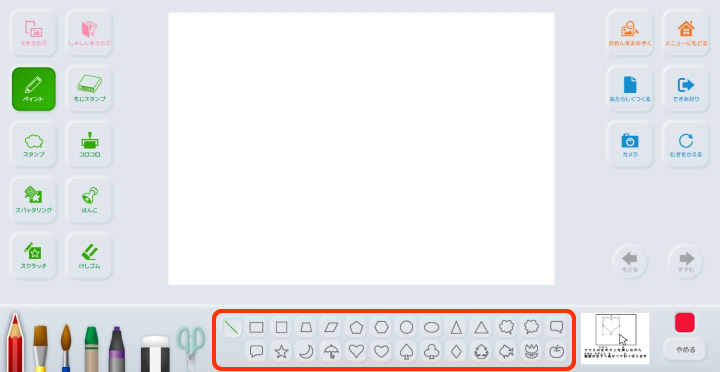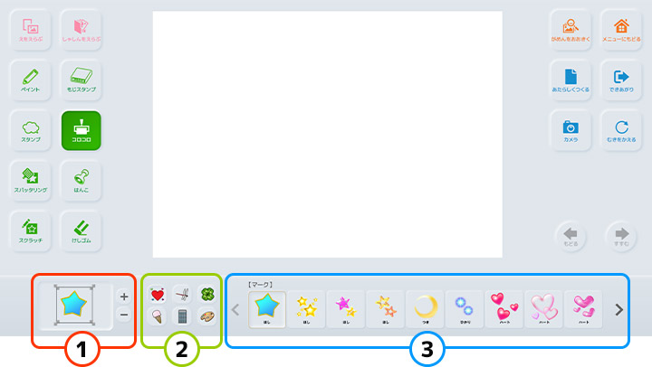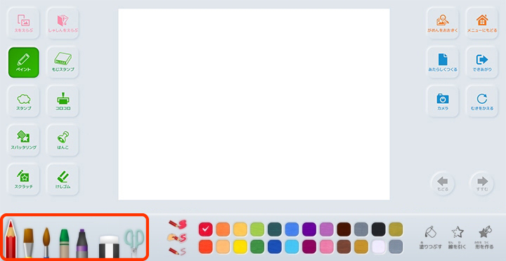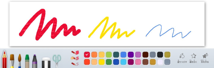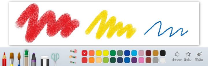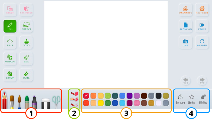 選択内容 説明 ① 画材(道具) 【色えんぴつ】【半透明水彩調】【アクリル調】【クレヨン】【マジック】【消しゴム】【はさみ】から選択することができます。 ② 太さ 画材の太さを3段階で変えることができます。 ③ 色 【色えんぴつ】【クレヨン】【マジック】の場合、24色の中から選択することができます。