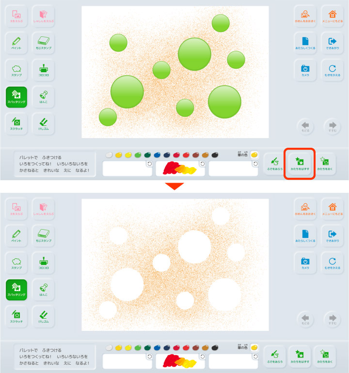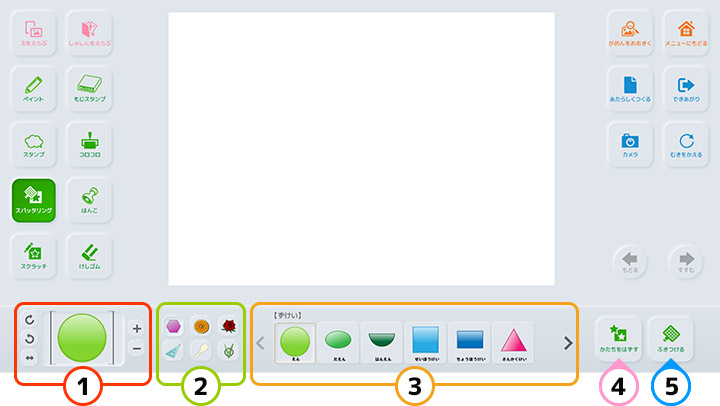 選択内容 説明 ① プレビュー 選択中の素材を確認できます。また、ここで任意の大きさに変えることができます。 ② カテゴリー 【型】の種類を変えることができます。 ③ 素材選択 使いたい【型】を選ぶことができます。 ④ かたちをはずす 画用紙に置いた【型】を全てはずします。 ⑤ ふきつける 色を作るパレットを表示し、画用紙に色を吹きつけます。 【型】を選択します。(※型を配置せず吹き付けだけでも描画することができます。)