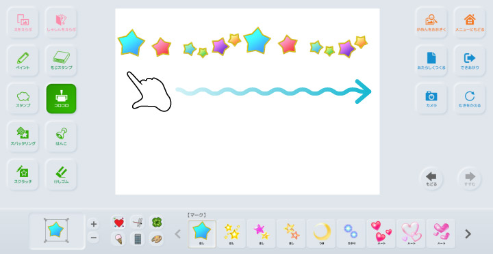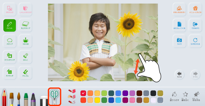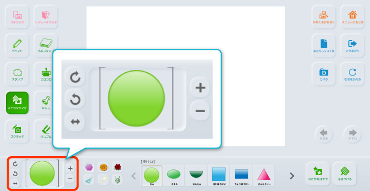 大きさ スタンプ素材の大きさを変えることができます。 画用紙の任意の場所をタップし、そのままスライドします。