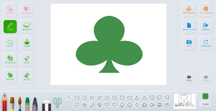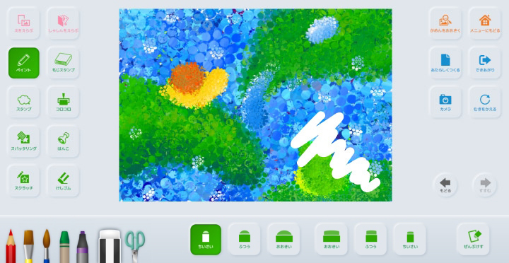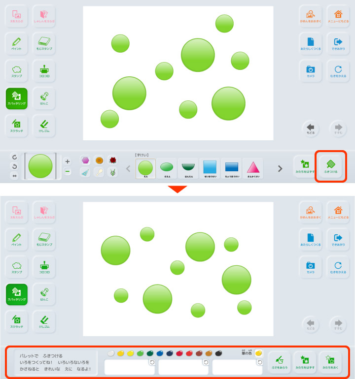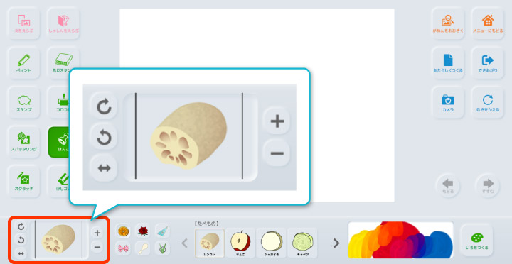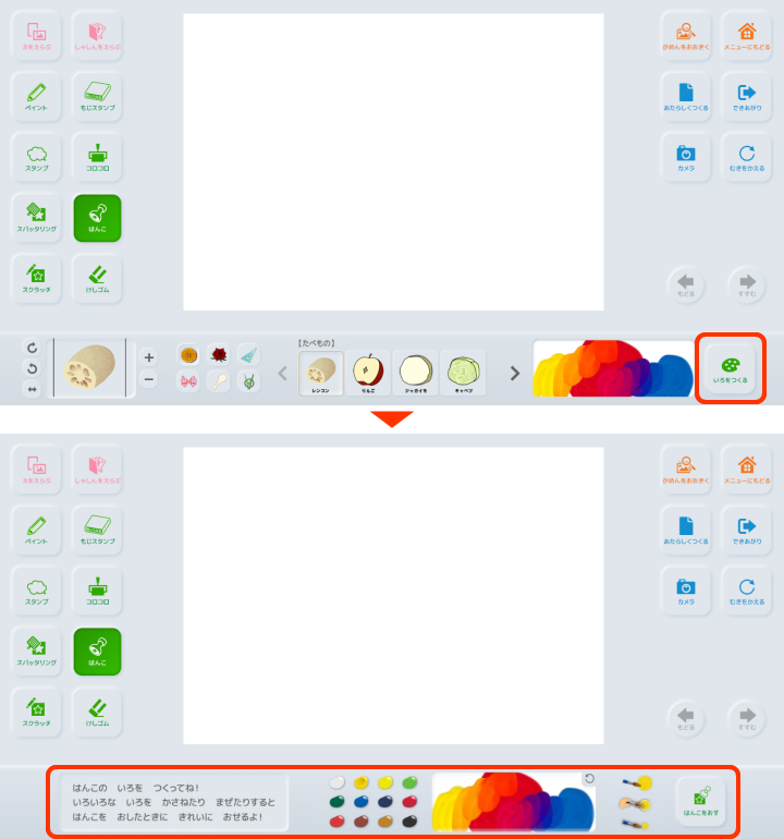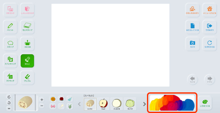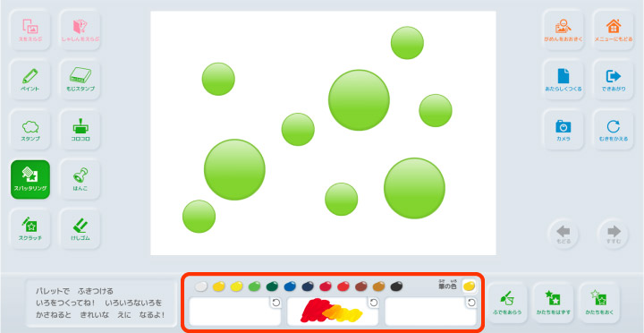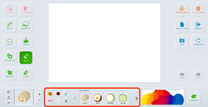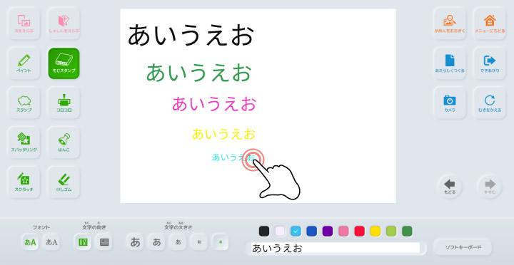 大きさ はんこ素材の大きさを変えることができます。 パレットをタップして素材に絵の具をつけます。