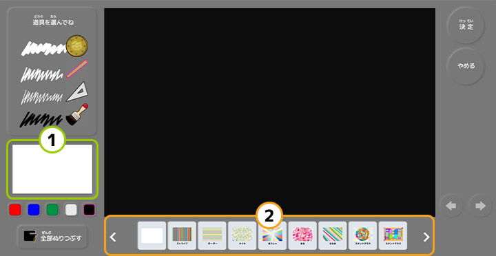 選択内容 説明 ① 全部ぬりつぶす 選択している色で、画用紙を全て塗りつぶします。 ② やめる スクラッチをやめてペイントの画面に戻ります。※スクラッチで描いたものは消えてしまいます。 ③ 戻る/進む 操作履歴を1つ前に戻します。/操作履歴を1つ先に進めます。