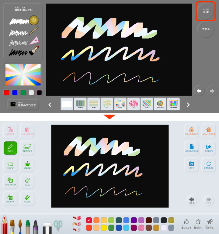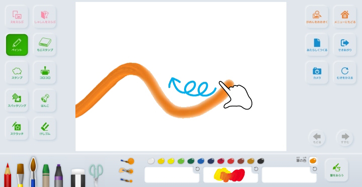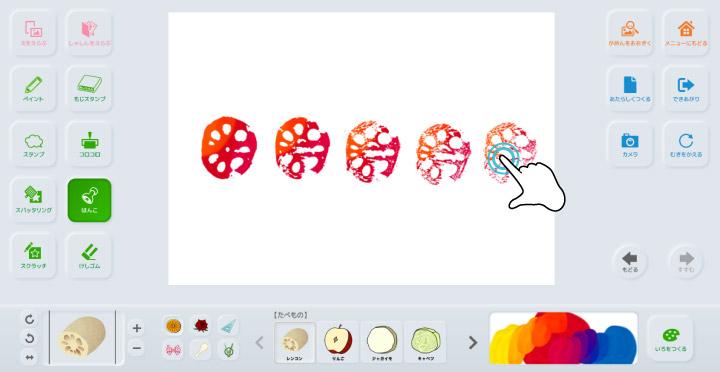 - 画用紙の上で一度タップすると、コロコロスタンプの最初のイラストだけを押すことができます。