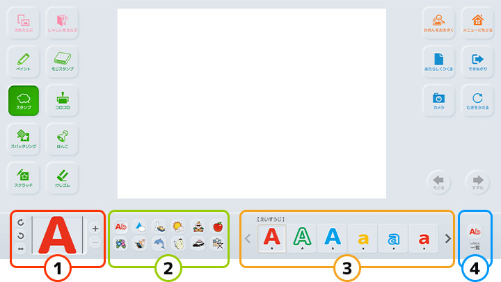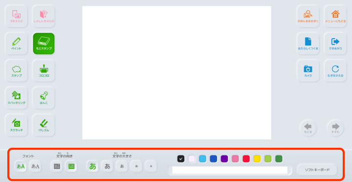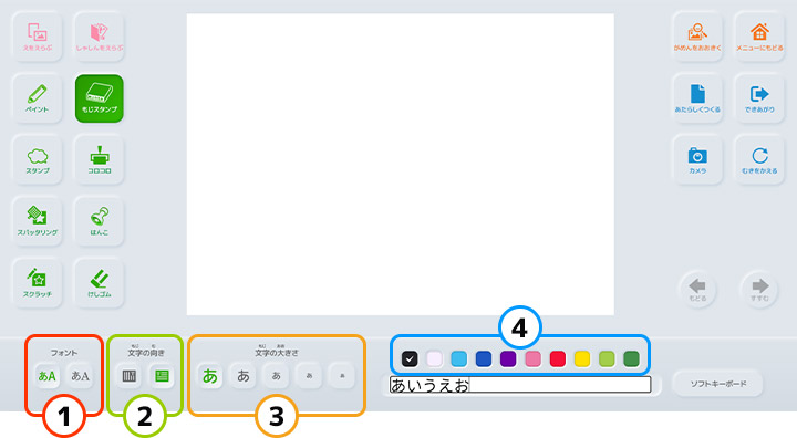 選択内容 説明 ① フォント フォントを明朝体とゴシックで切り替えることができます。 ② 向き 文字の向きを縦と横に切り替えることができます。 ③ 大きさ 文字の大きさを五段階で変えることができます。 ④ 色 文字の色を変えることができます。 画用紙をタップすることで文字を押すことができます。
