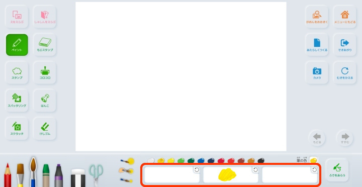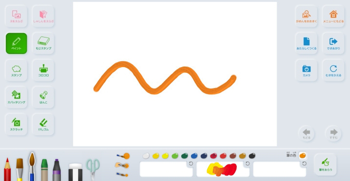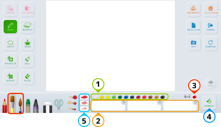 機能名 説明 ① 色 12色の中から選ぶことができます。 ② パレット 色を混ぜ合わせたりすることができます。 ③ 筆の色 選択されている色が表示されます。 ④ ふでをあらう 選択された色をリセットし、水を含ませた状態にすることができます。 ⑤絵の具の濃さ 描画するときの色の濃度を3段階から選ぶことができます。