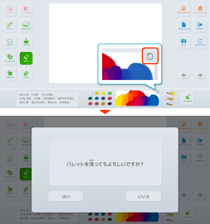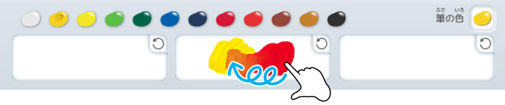 パレット内で混ぜた色を使う際は【ふでをあらう】を選択してから対象の色をとります。