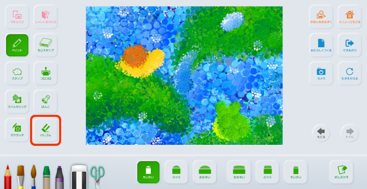 描いた絵を消しゴムで部分的に、もしくは背景イラストを残したまま、描いた絵を全て消すことができます。