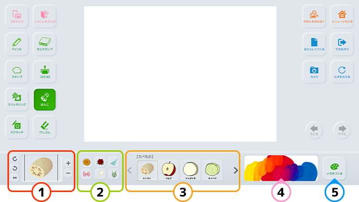 選択内容 説明 ① プレビュー 選択中の素材を確認できます。また、ここで大きさや向きを変えることができます。 ② カテゴリー 素材の種類を変えることができます。 ③ 素材選択 はんこに使いたい素材を選ぶことができます。 ④ パレット はんこ素材に色をつけることができます。 ⑤ 色を作る 絵の具の色を作ることができます。 カテゴリーから使いたい素材を選択します。