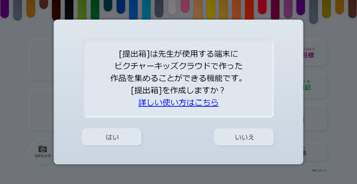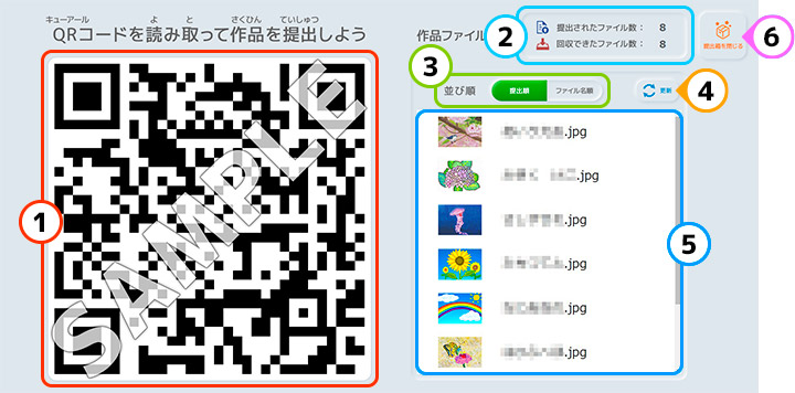 | ① QRコード | 提出箱にアクセスするためのQRコードが表示されます。他の端末から作品を提出する場合は【できあがり】から、このQRコードを読み込むことでファイルを提出することができます。(表示されるQRコードは毎回異なります。) ※提出の詳しい操作は5章 3. 作品を提出してみようをご覧ください。 |
