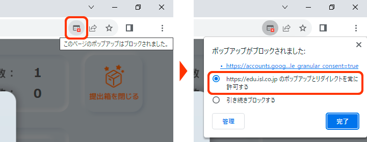 そのアイコンをクリックして、「https://edu.isl.co.jp からのポップアップとリダイレクトを常に許可する」を選択してください。操作その2