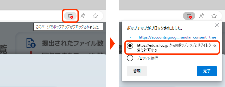 そのアイコンをクリックして、「https://edu.isl.co.jp のポップアップとリダイレクトを常に許可する」を選択してください。操作その2