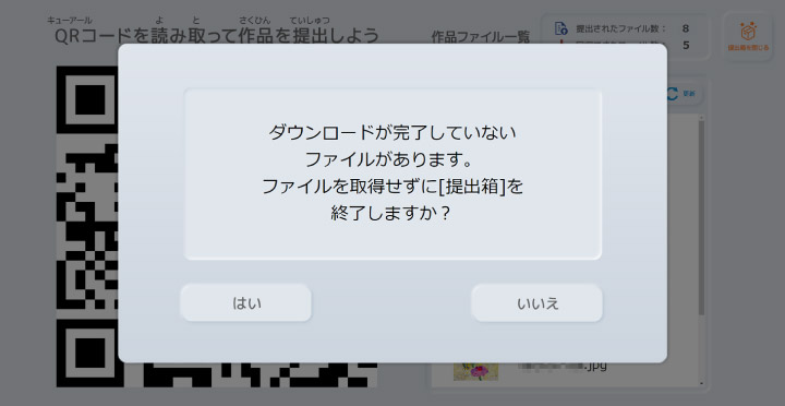 ※ファイルの回収が完了していない状態で【提出箱を閉じる】を選択すると下記ウィンドウが表示されます。